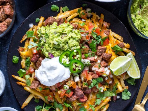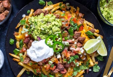 Our Asada Fries are a mouthwatering fusion of crispy French fries loaded with tender, grilled carne asada and topped with a fiesta of fresh flavors. Layered with zesty pico de gallo, creamy guacamole, crisp lettuce, juicy tomatoes, and rich sour cream, these fries are taken to the next level with melted cheese and spicy jalapeños for an extra kick.